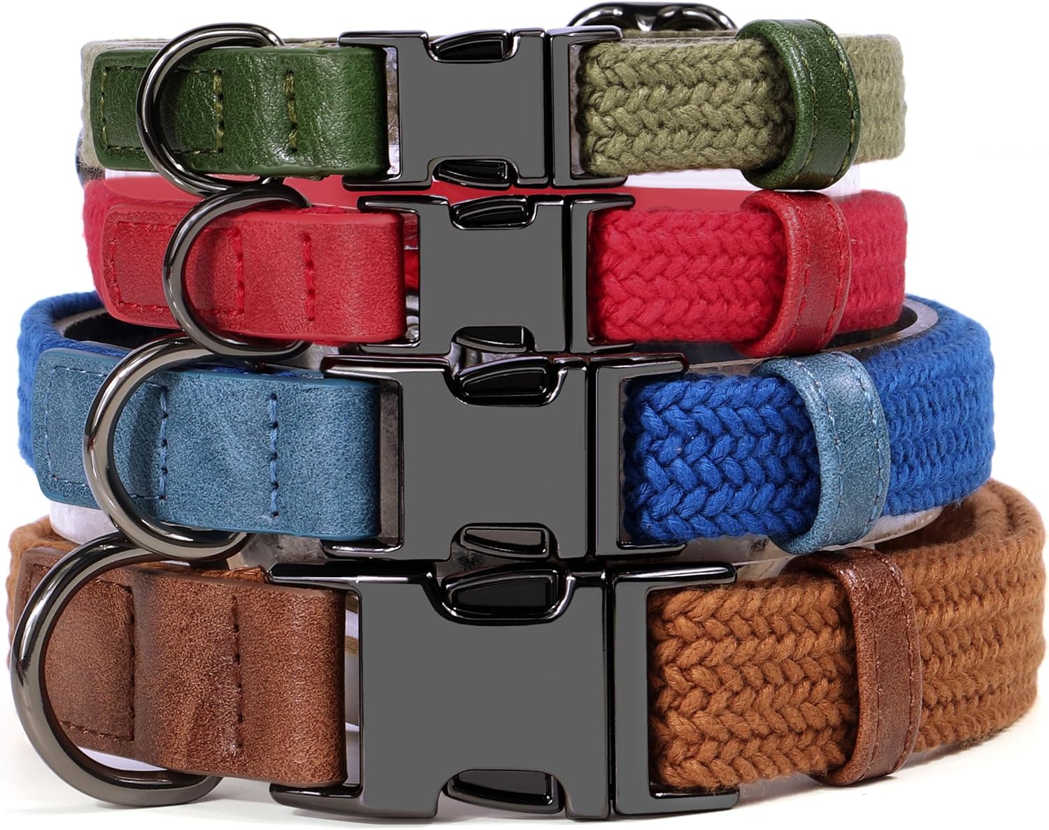 - Color Design in Different Styles: The dog collar is generally based on simple and classic single colors. The black metal buckle adds a touch of texture to the collar. There are four different colors available: Rustic brown, Stylish green, Glamorous red, and Tranquil blue, which can highlight the different personalities of dogs. Choose a color that suits your dog's personality!