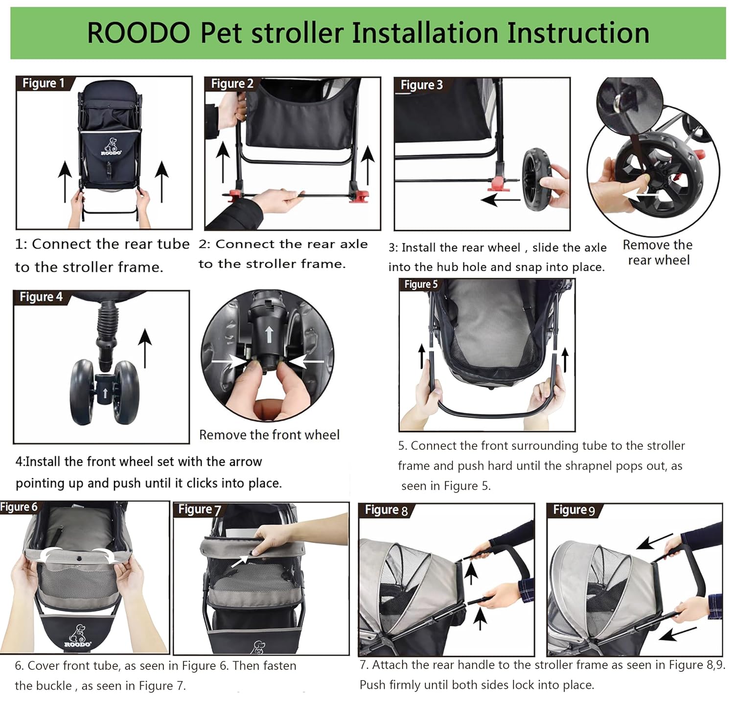 - ROODO multifunctional 4 wheel pet stroller is smooth and easy to use. The pet rest area is covered with multi-directional breathable nets to enjoy the fresh air and protect your pets from insects. Equipped with a storage basket for easy storage of items. The pet stroller can be folded easily and compactly enough to fit into the trunk of the car. It is a great choice to bring your pet, walk, jog, travel and enjoy the outdoors together.