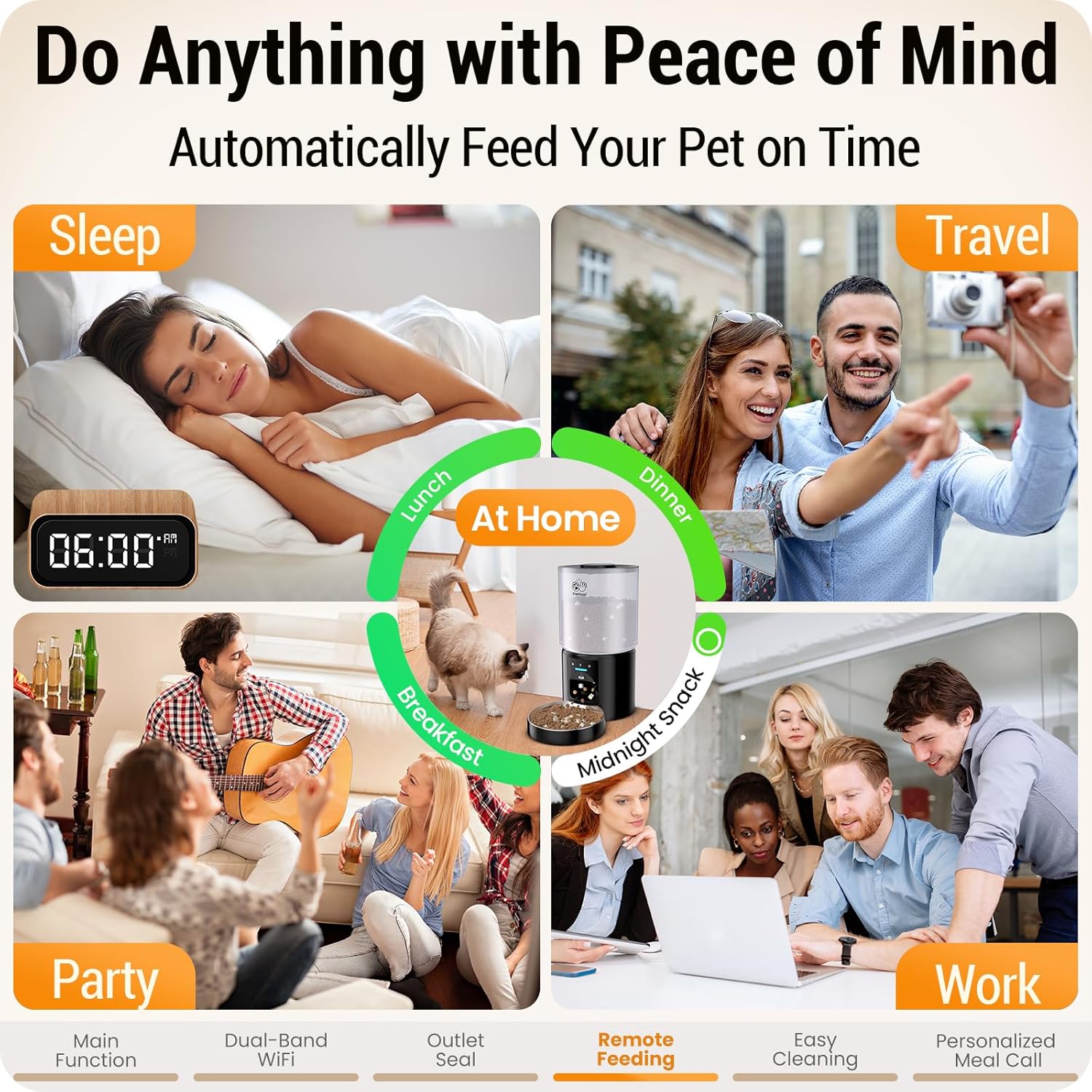 • Dual-band WiFi : The automatic cat feeder with app supports dual-band WiFi (2.4GHz & 5GHz). Dual-band wifi means you don't have to modify your router for channel compatibility issues. Faster 5G networks allow for a more stable signal.