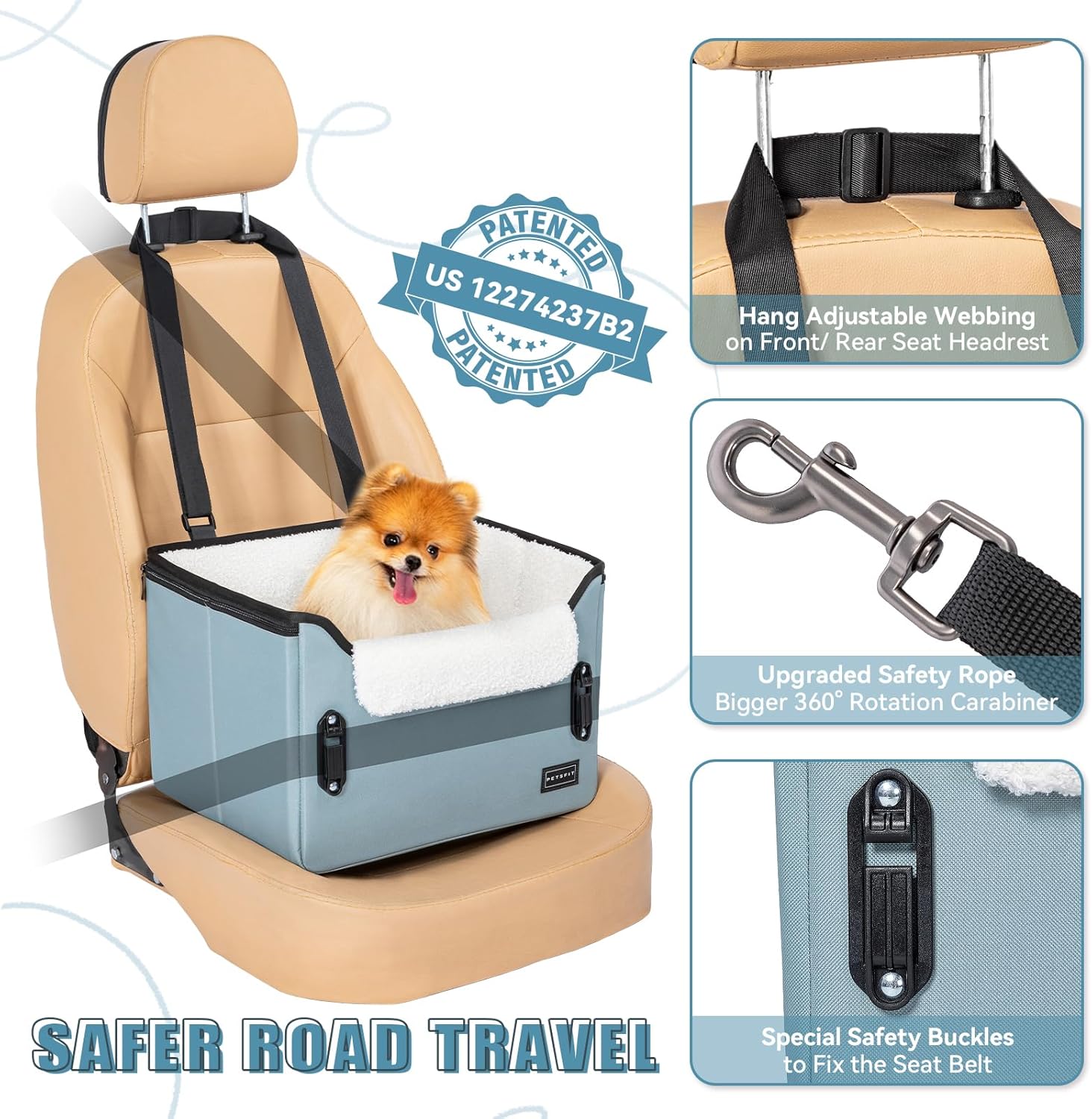 - [Patented Buckles Provide More Security] With your pet's safety as our top priority, the dog car seats for small dogs feature patented safety buckles (Patent Number: US 12274237B2) and an adjustable safety belt. These features secure the dog booster car seat in place, allowing your pet to stay comfortably secure and letting you enjoy stress-free journeys