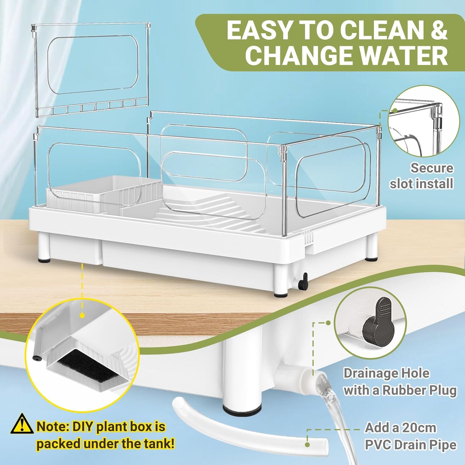 • 【EASY TO USE AND CLEAN】Keep your turtle tank clean and hassle-free with bottom drainage feature. Simply drain the water, remove debris, and refill for a healthier habitat. There is a DIY plant box is packed under the tank, you can use our included colored stones and trees to decor the landscape of the turtle aquarium.