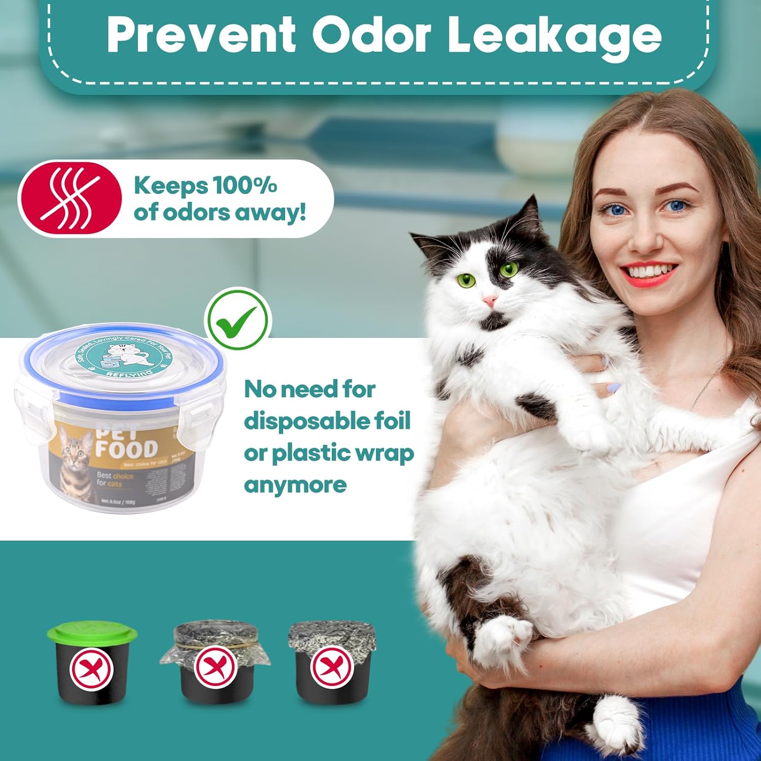 • SAY GOODBYE TO USING PLASTIC WRAP: No more plastic lids, aluminum foil and plastic wrap for canning lids. These clear canned cat food containers allow direct access to the food, isolate odors, are easy to use, and keeps the freshness of your pet's canned food