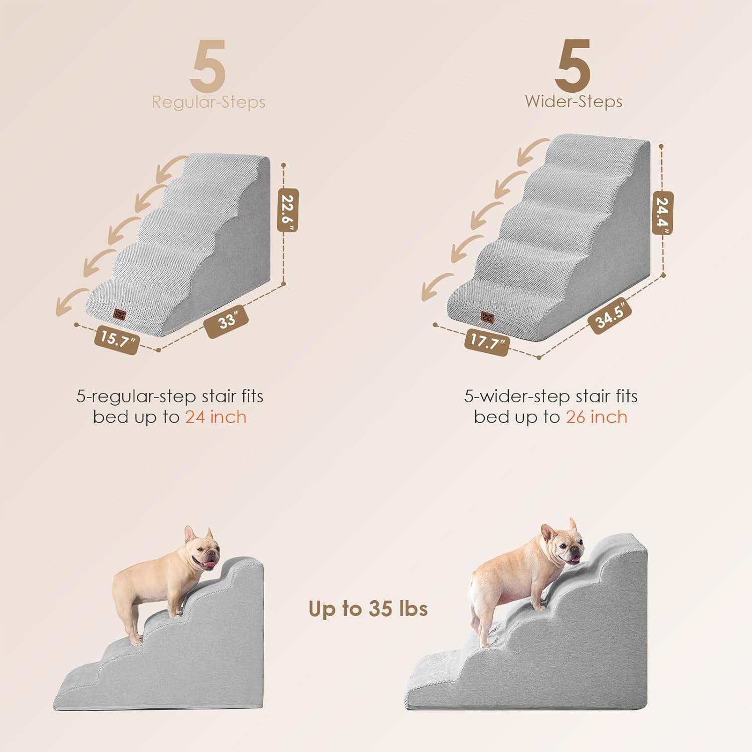 • MULTIPLE STEP SIZES - This dog stair has 2 steps, 3 steps, 4 steps and 5 steps to choose. Our 2-step stairs fits for chair/sofa/bed up to 13inch. 3-step stairs fits for chair/sofa/bed up to 17inch. 4-step stairs fits for chair/sofa/bed up to 21inch. And 5-step stairs fits for chair/sofa/bed up to 24inch.