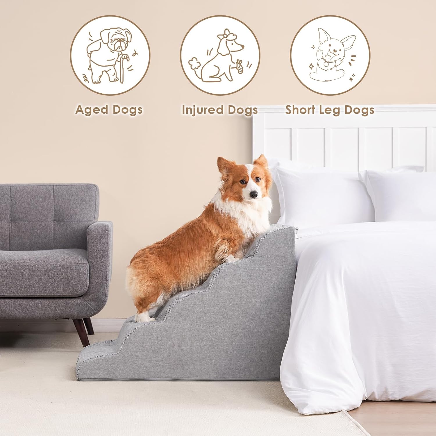 • COMFORTABLE PET STAIRS - This foam dog stair is designed directly against the edge of a bed, sofa or other furniture, so your pet can climb up and down comfortably.