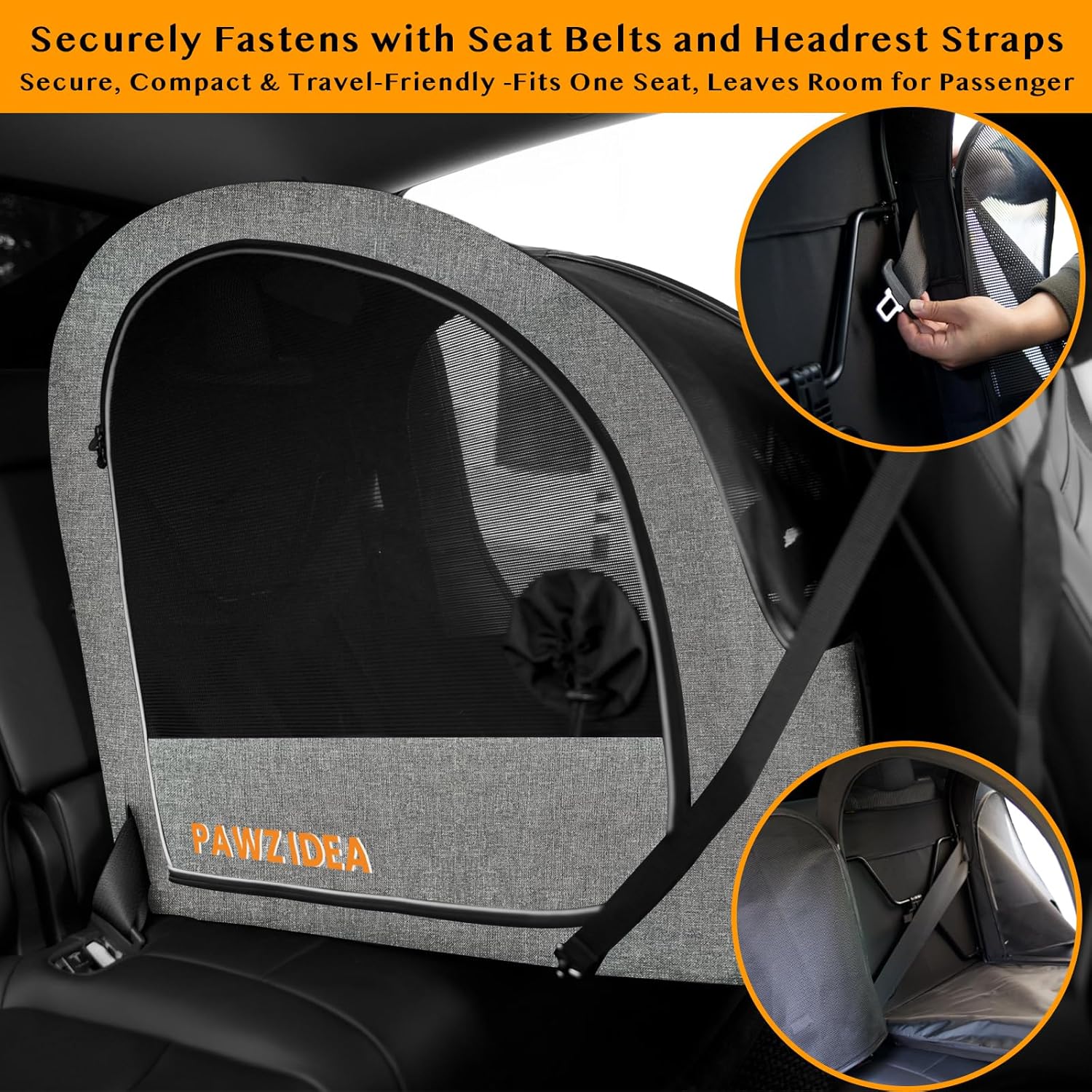 - Convenient Dual-Side Entry & Compact Design - Dog crate features doors on both sides, allowing easy pet access from either the driver or passenger side of your vehicle. Compact enough to occupy a single car seat, leaving ample space in the rear for human passengers. Install fabric cover first (align all 6 holes). Fully expanded and tested for stability, close the crate. Place on car seat, expand again, and secure with seat belt & headrest strap.