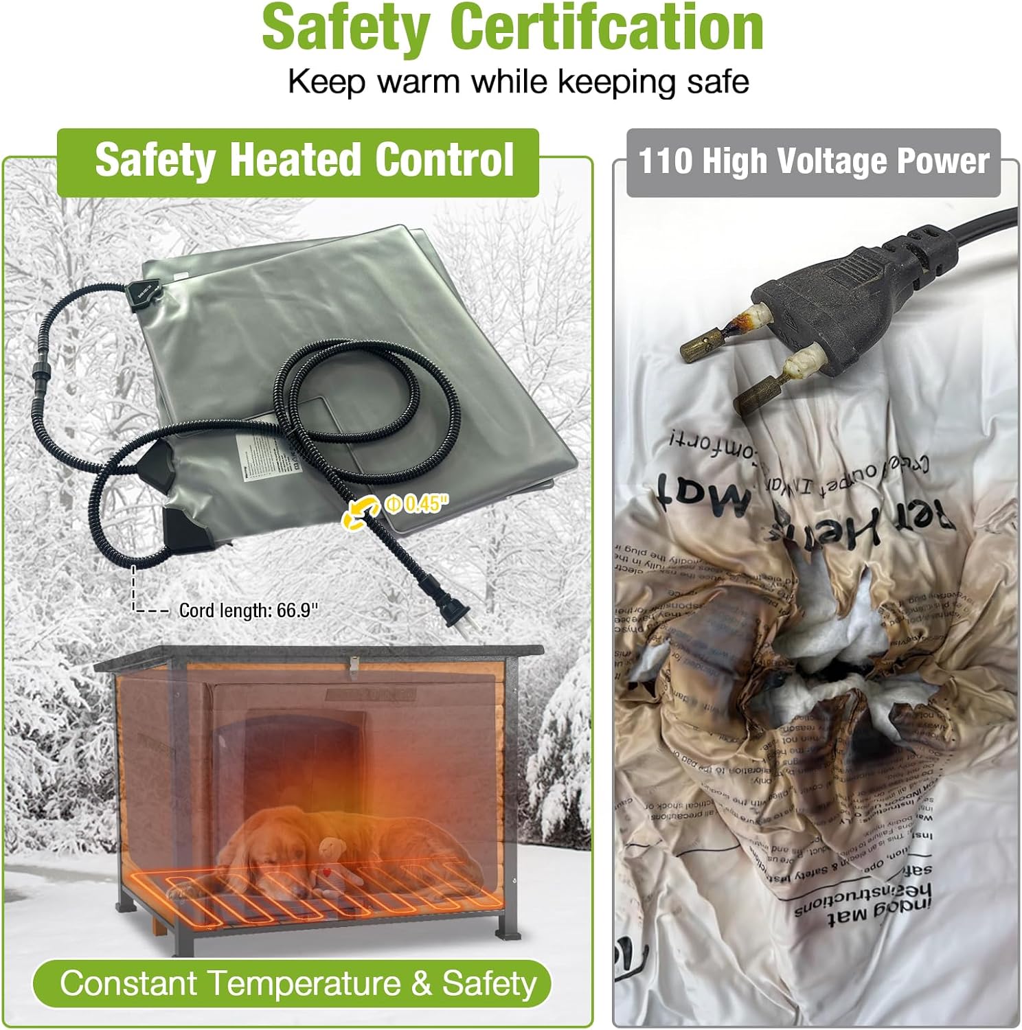 - Safe Heating System: : UL tested heating pad with automatic heated control, temperature from 89 to 116°F. Build in high-temperature protection device preventing overheating or chilling. 6.5 ft chew-resistant cord adds an extra layer of safety
