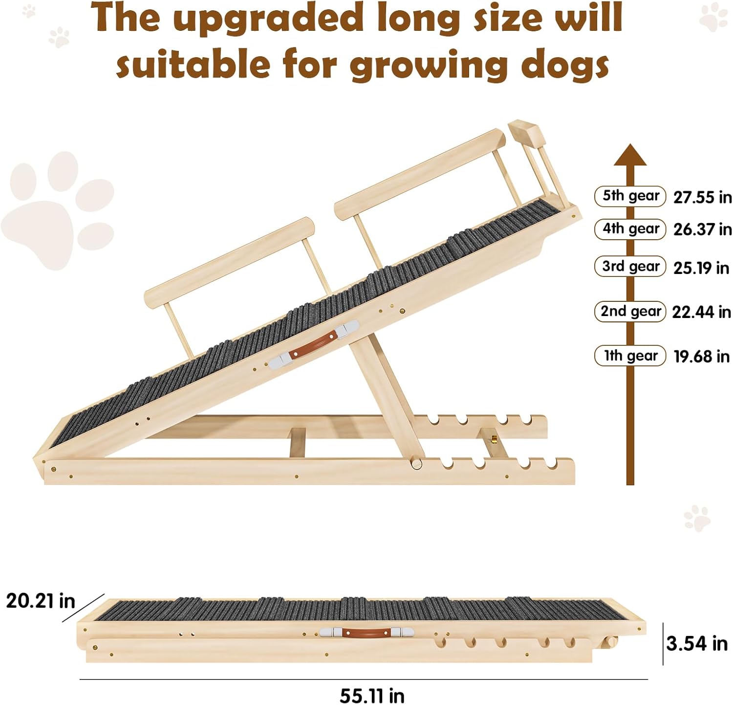 - Unbreakable Integrated Construction: Built to last with solid 1" thick pine wood and a seamless, non-folding design, this ramp eliminates weak joints for superior load-bearing capacity. The extra-long 55.11" wooden strip and reinforced structure ensure zero wobbling, while rigorous safety testing certifies it holds pets up to 250lbs—ideal for large breeds or multi-pet households.
