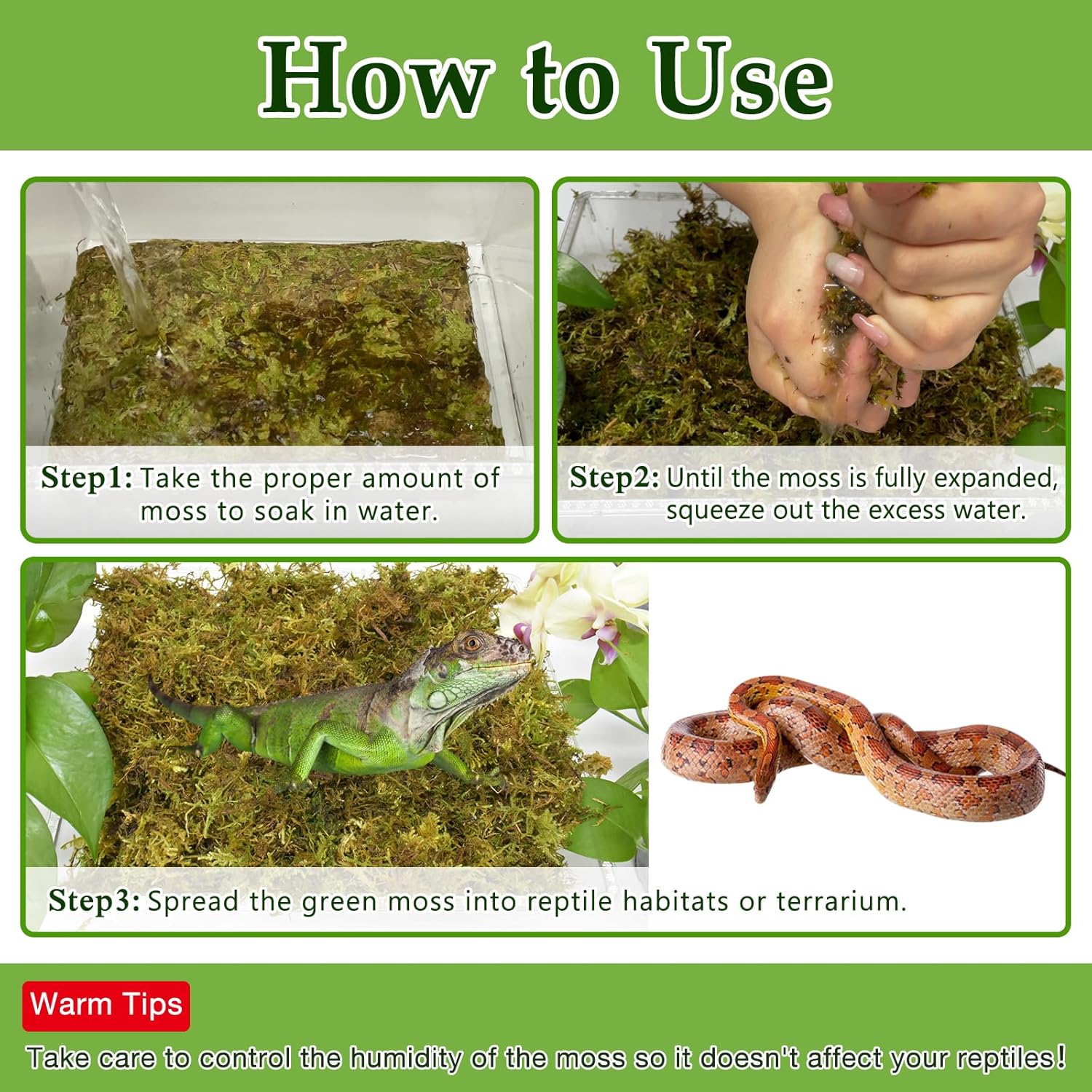 • Natural & No Dyes: This premium reptile moss are all natural, soft and comfortable. There is no offensive highlighter green dye in this green moss. You can use it for your reptiles and plants with ease.