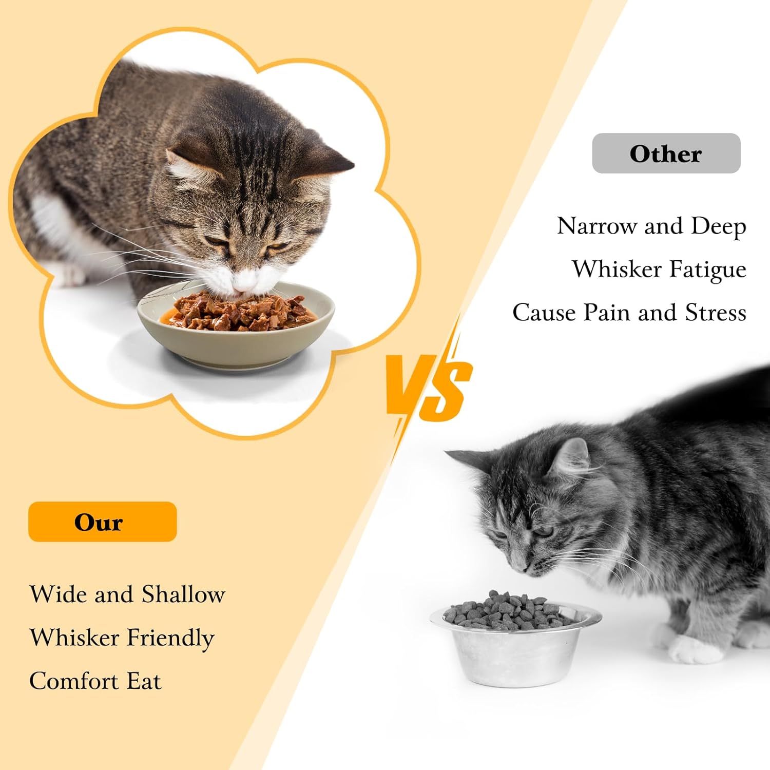 - Cat Bowls Whisker Friendly:The flat cat food dishes with a wide and shallow round design(5.6 inches wide, 1.4 inches deep, 200ml capacity).Not only keeps the face clean and tidy, but also relieves the cat's whisker fatigue, creating a comfortable eating environment for the cat