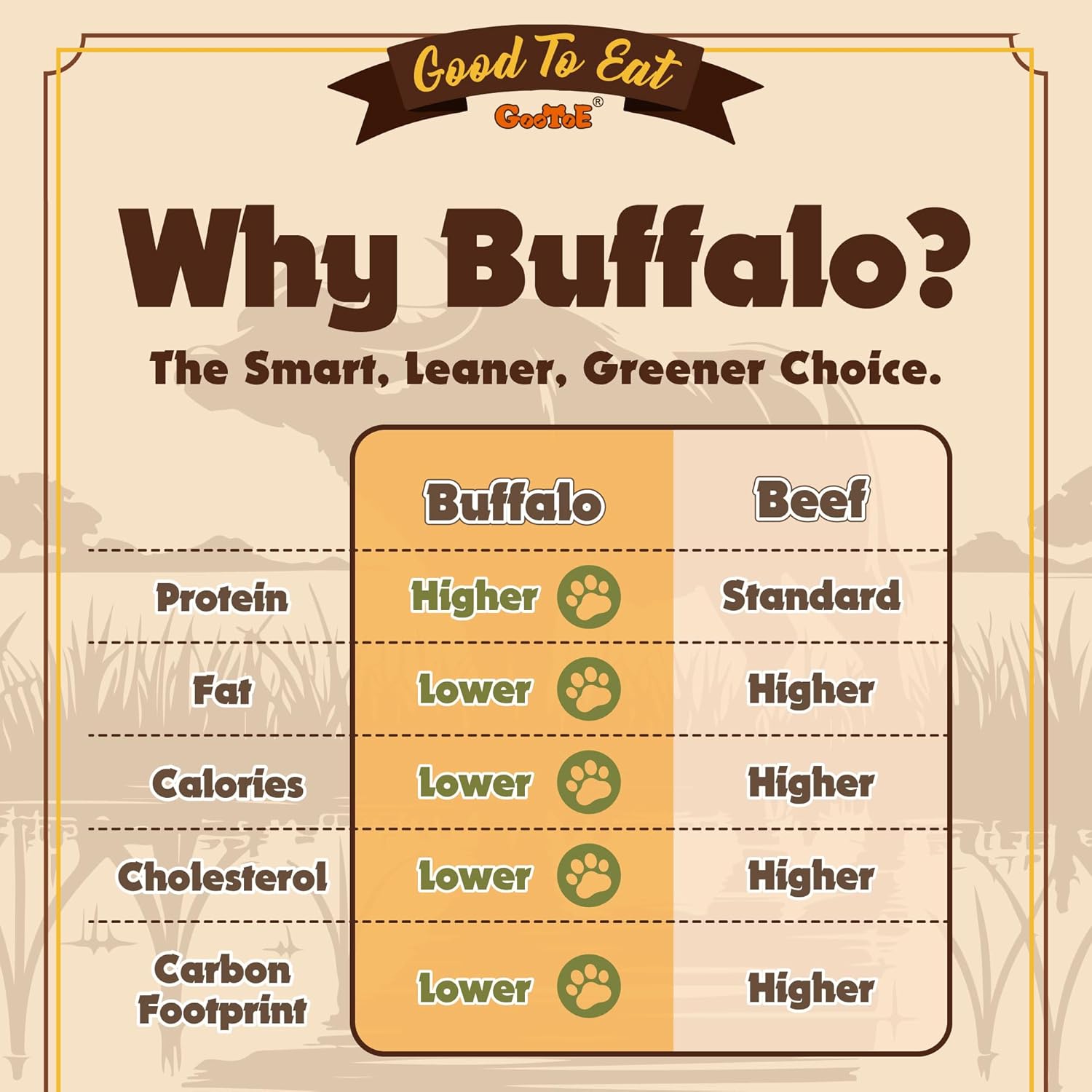 • Healthier & Tastier: Buffalo is a lean protein with less fat and fewer calories than beef, making it a nutritious choice for your dog. Naturally rich in essential nutrients and beneficial fatty acids, it supports a shiny coat, healthy skin, and overall well-being.
