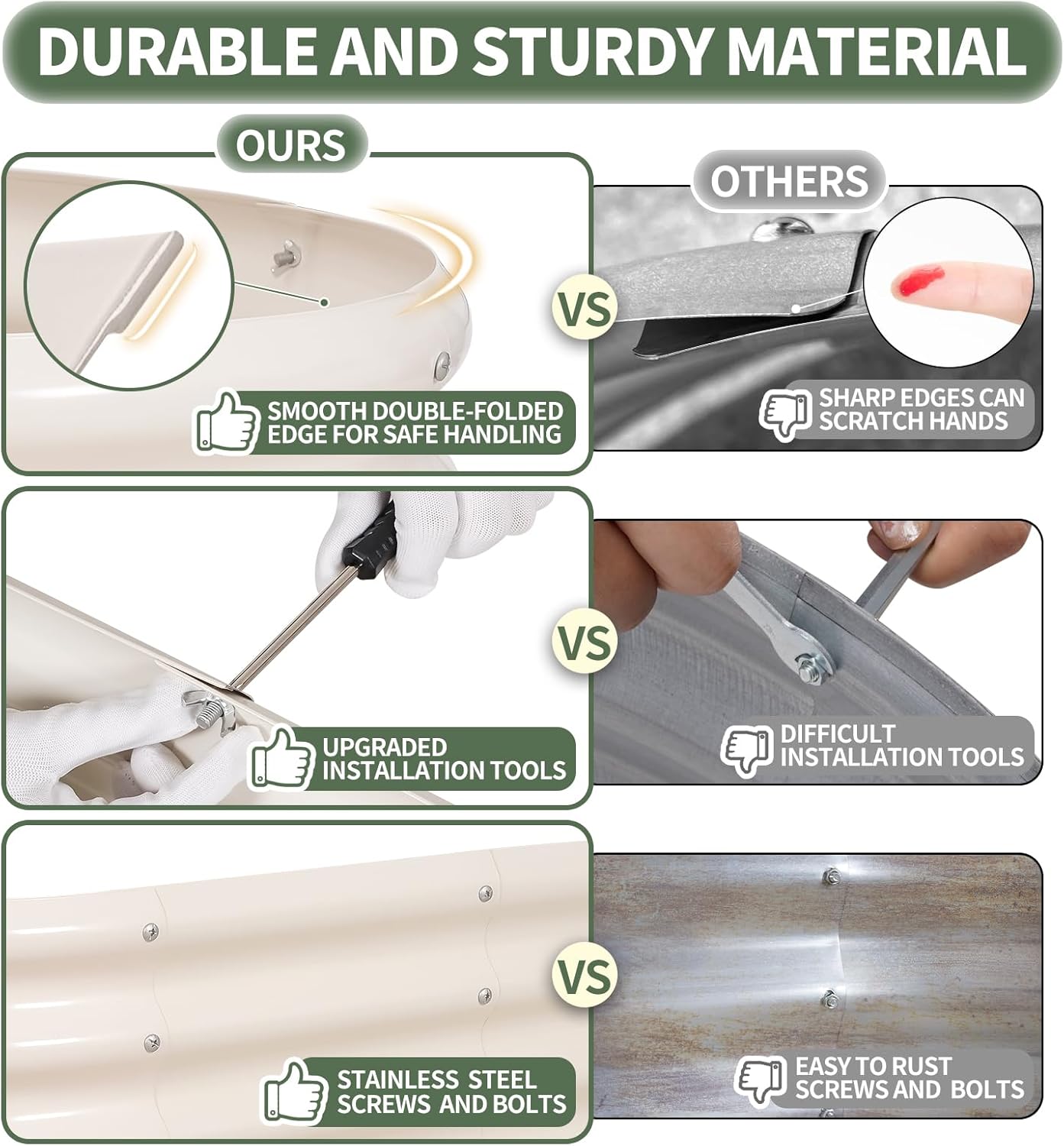 • 【High-Quality Materials & Durable】 Made from 0.7mm galvanized metal panels with double-layer anti-corrosion galvanization, this outdoor raised garden bed features a robust oval-shaped design for added strength and durability. Resistant to rust and corrosion, it provides a long-lasting gardening solution that can be reused for many years, ensuring a sustainable and reliable space for your plants to thrive