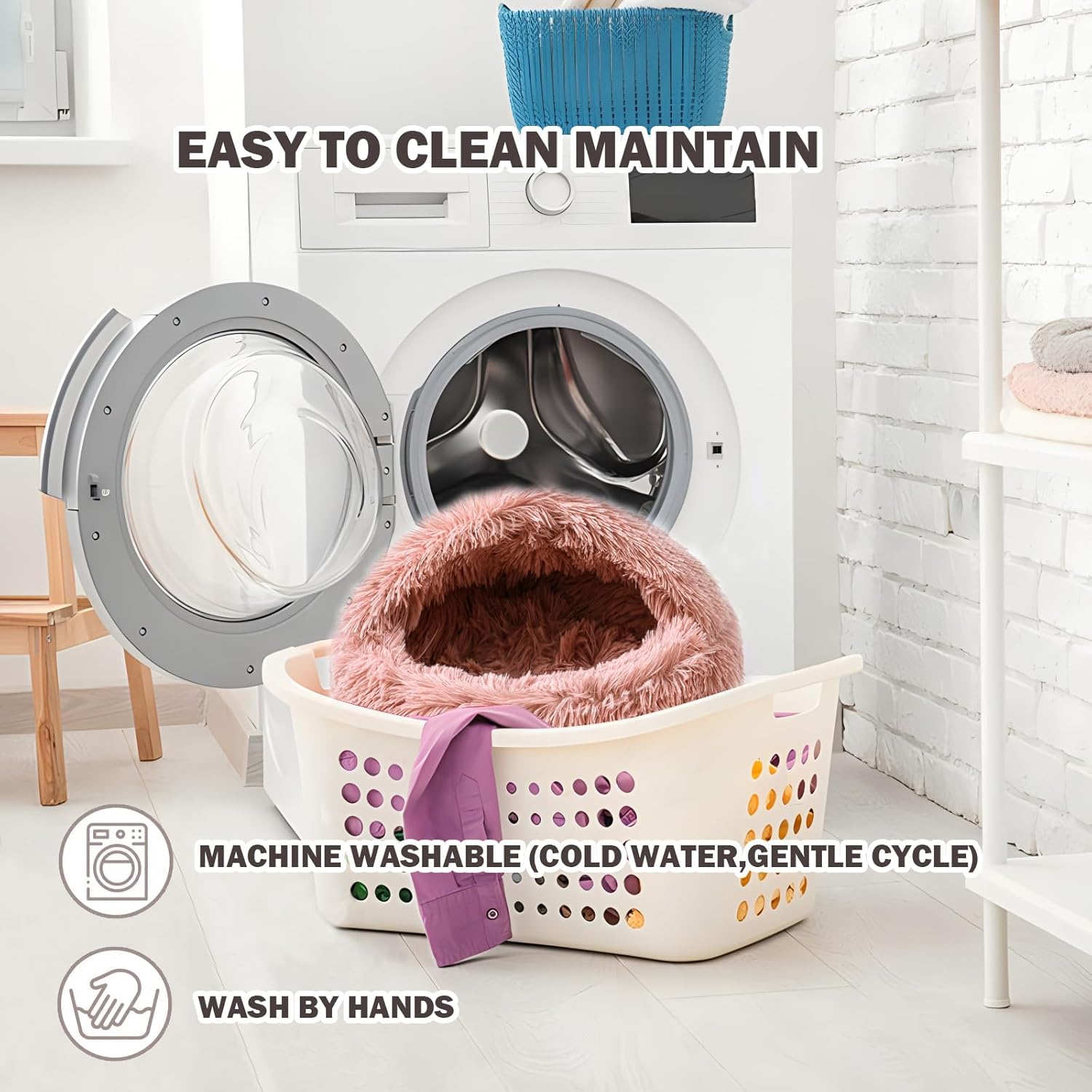 Cat Bed for Indoor Cats, Calming Cozy Cave with Self-Warming Plush, Entire Bed Machine Washable & Anti-Slip Base, Breathable Pet Bed for Small Cats&Dogs All Seasons (Leather Pink, 24 * 24inch)