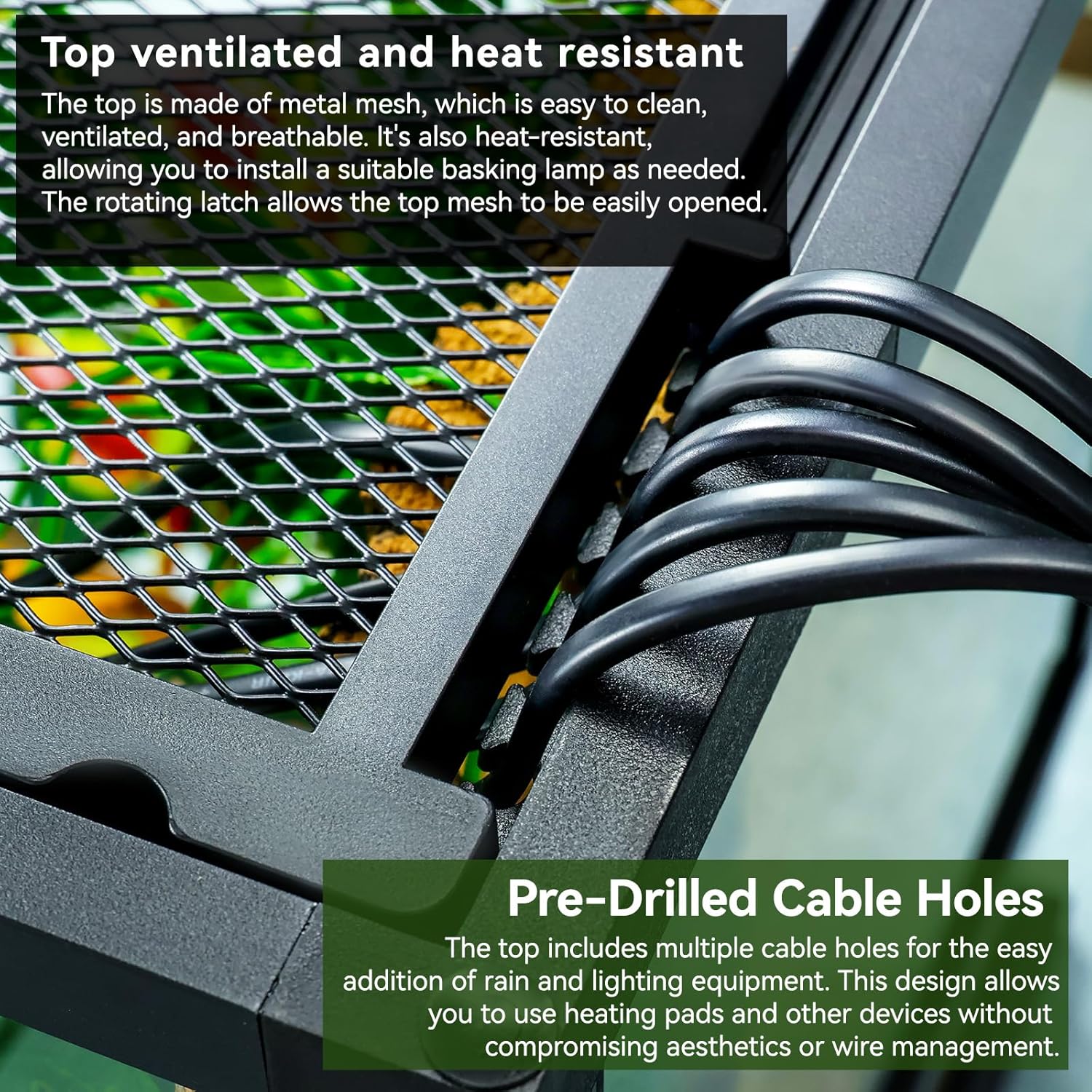 • 【Pre-Drilled Cable Holes】The top includes multiple cable holes for the easy addition of rain and lighting equipment. This design allows you to use heating pads and other devices without compromising aesthetics or wire management, making it suitable for any reptile tank, from a snake cage to a crested gecko tank.