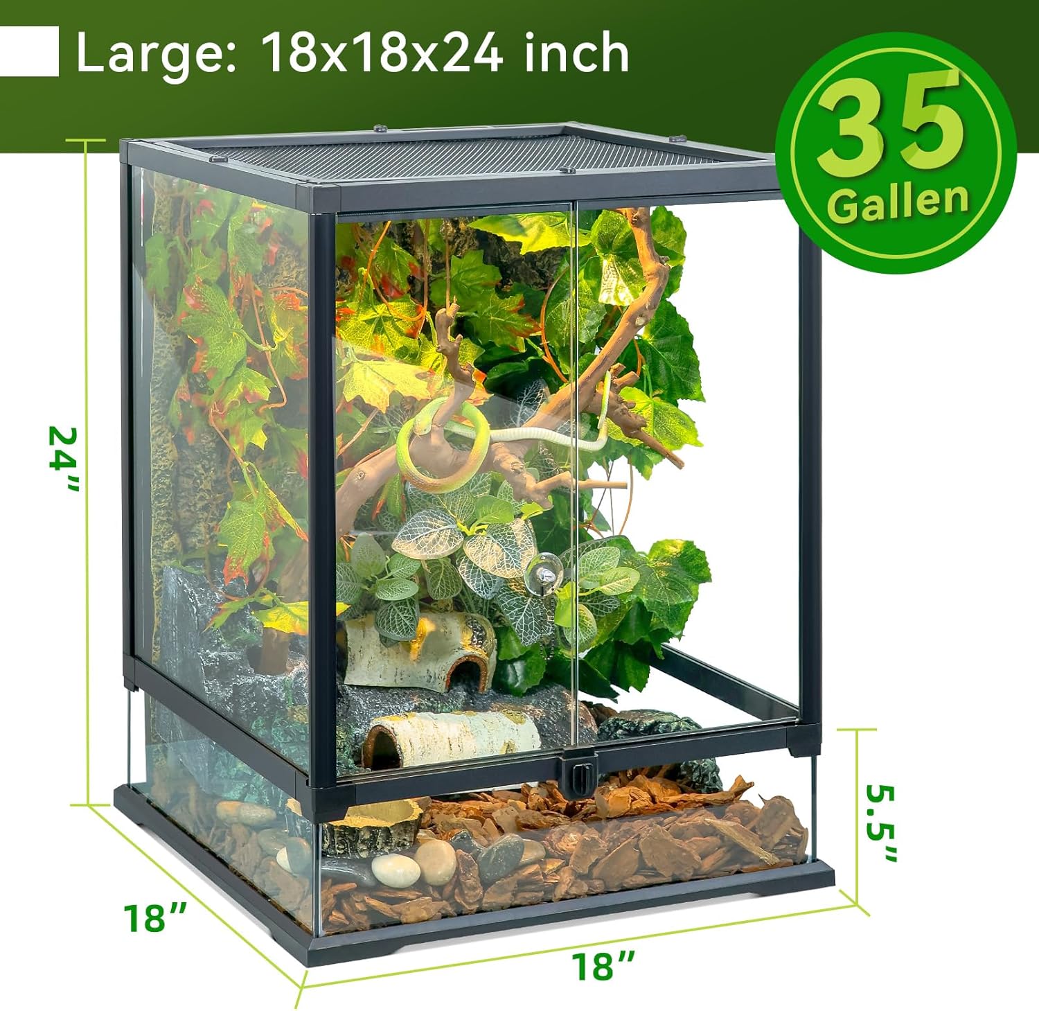 Glass Reptile Tank Front Opening Terrarium Suitable for Leopard Geckos, Snakes, Tree Frogs, Chameleons,Watertight Base, Ventilated Metal Mesh Top, Pre-Drilled Cable Holes 23.9x18x18''