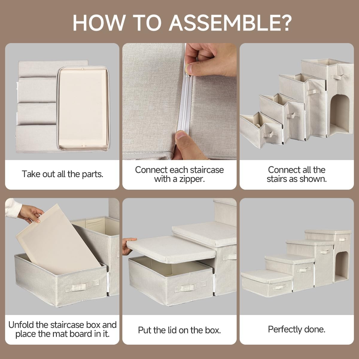 • Easy to Assemble: First, you need to attach the zipper of each step, then open each step completely, put each support board into the corresponding storage box, and finally close the lid. When not needed, remove the lid and fold it completely so you can easily move, transfer and store it. This saves space and is suitable for small rooms