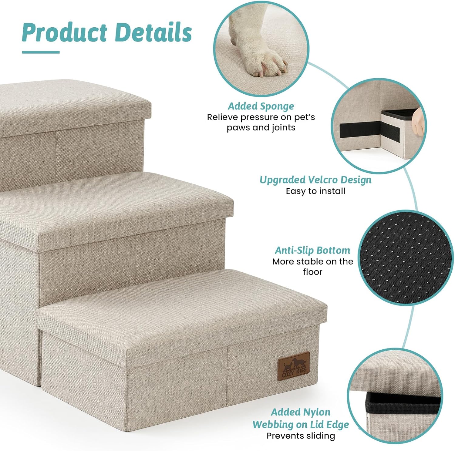 Dog Stairs with Storage, 3-Step Wider Sturdy Dog Steps for Small/Medium/Large Dogs and Older Cats, Folding Doggie Ramp for Bed/Couch/Car Hold Up to 180 lbs (16.7" H, Beige)