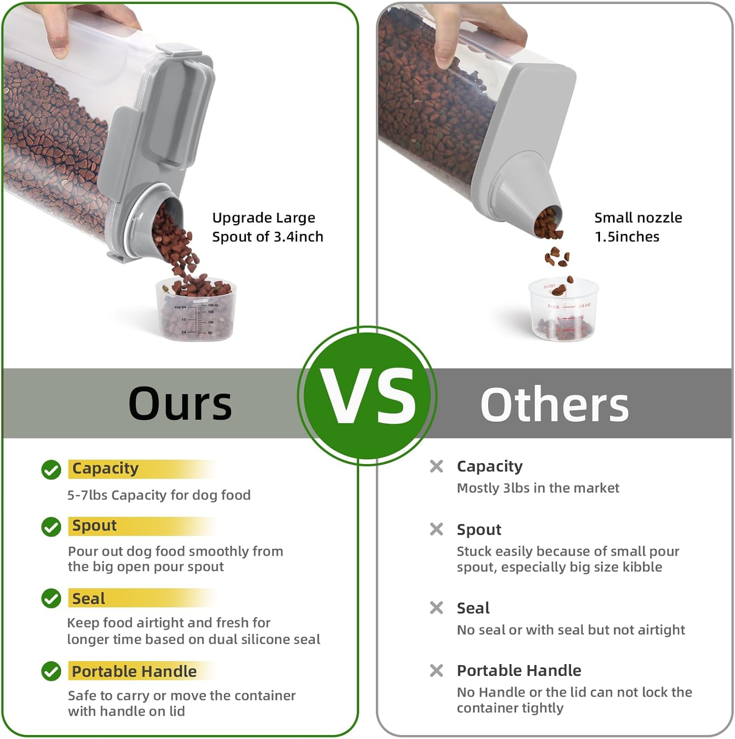 • BENEFITS : Upgraded Large Pour Spout with Measuring Cup-We upgraded the mold so that the pour spout is large enough to pour out large dog food.You can now pour food easily and quickly.The newly upgraded measuring cup can now also be easily screwed onto the nozzle