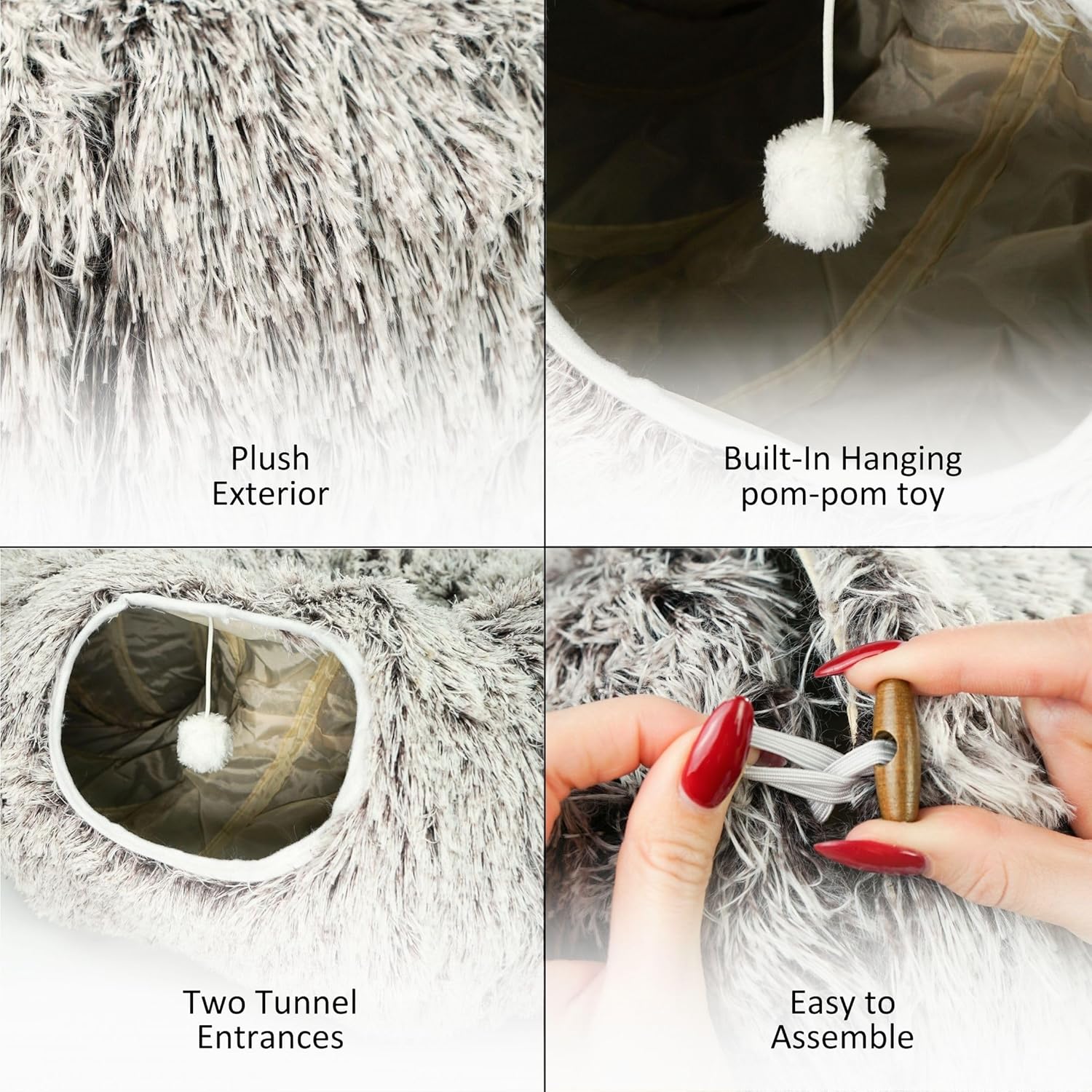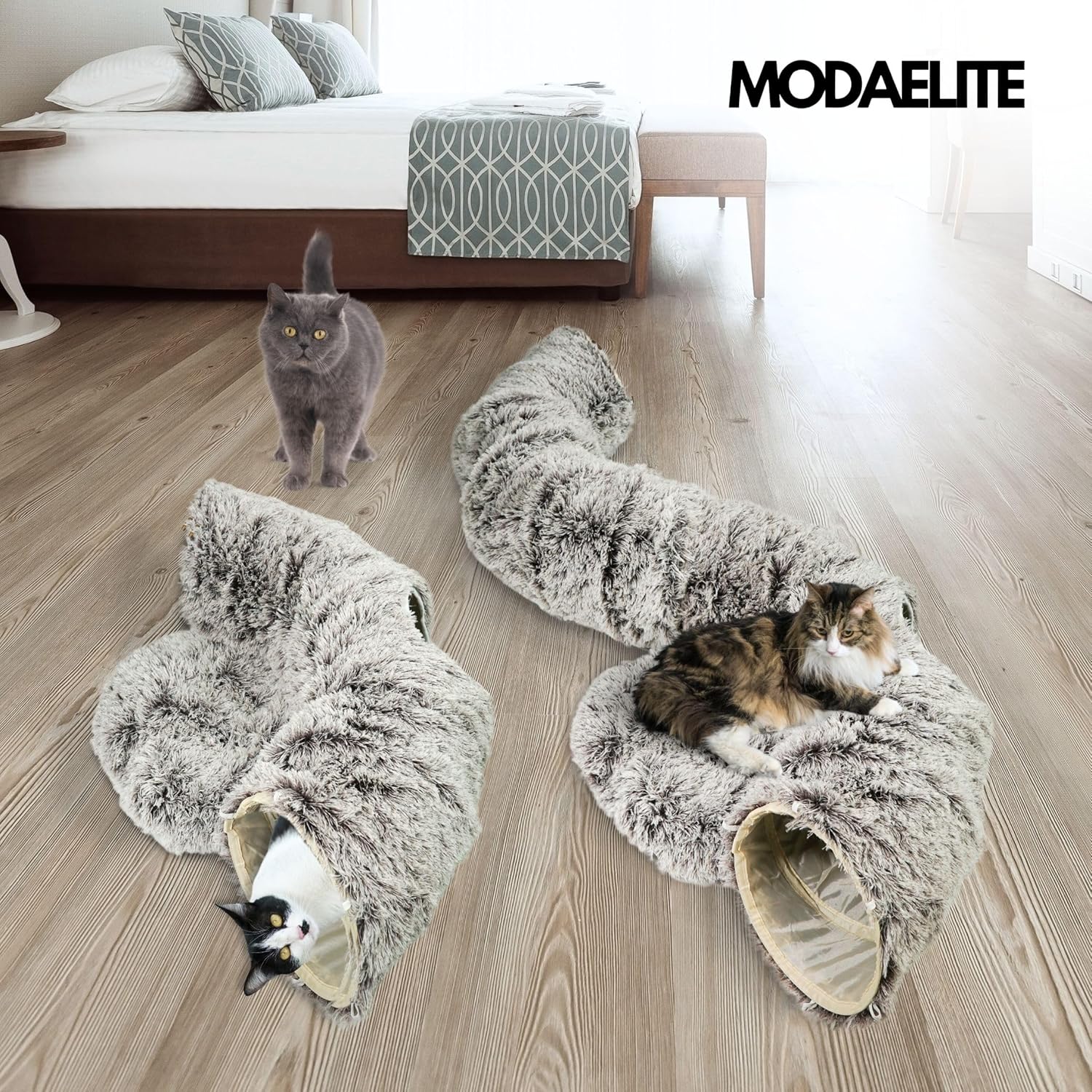 - COZY HIDEAWAY AND PLAYFUL DESIGN: Plush enclosed nook with dangling pom-pom toy creates a secure retreat in your MODAELITE cat tunnel bed or cat tunnels for indoor cats, doubling as a luxurious cat bed