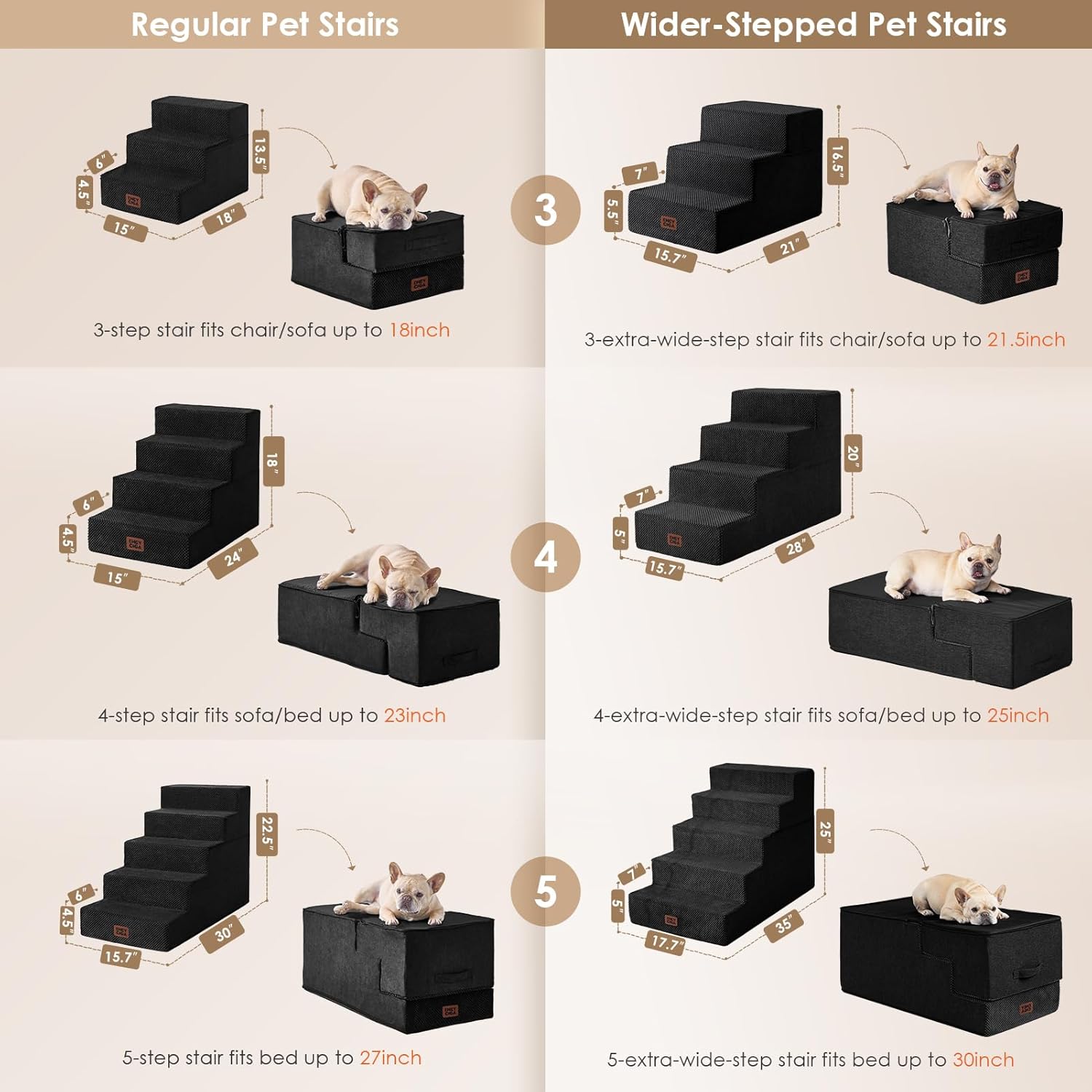 • MULTIPLE STEP SIZES - This dog stair comes in 3, 4, and 5-step options. Our 3-step pet stair is ideal for sofas and low beds (up to 18 inches high), while the 5-step version is better suited for higher beds (up to 27 inches). If your bed is of medium height (up to 23 inches), please select the 4-step one.