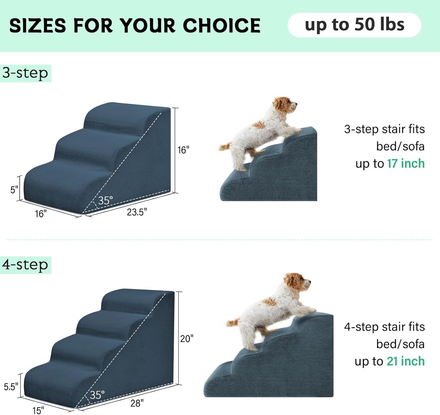 • 【Multiple Stairs Size to Choose】TWO-STEP: 15.7"L*16.5"W*11.8"H, THREE-STEP: 23.5"L*16"W*16"H, FOUR-STEP: 28"L*15"W*20"H. It's a dog stair for most high beds, couch and sofa.