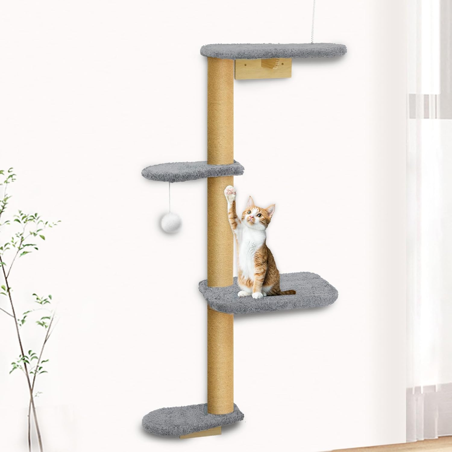 • Triple-Anchor Mount for Steady Support: This wall-mounted cat climber anchors at three secure points to ensure maximum stability. From climbing to jumping, your cat’s movement stays supported. The jute posts provide traction during ascent, and the soft plush cushions minimize impact when landing—keeping curious kittens safe and confident.