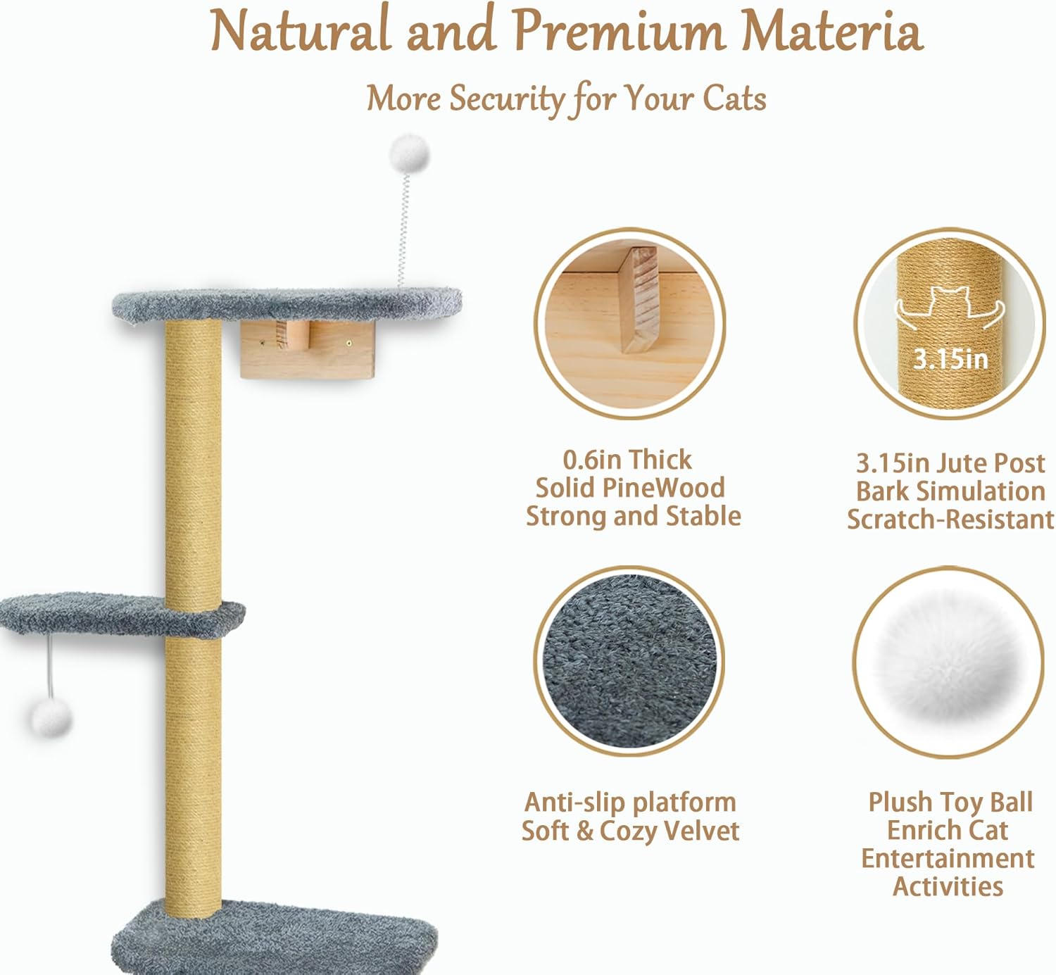 • Plush-Covered Platforms for Cozy Landings: Crafted with pine wood and wrapped with jute rope, the frame offers durability and scratch resistance. Each level is topped with soft grey plush cushions—comfortable, warm, and anti-slip, ideal for napping after playtime. The materials are gentle on paws yet tough enough for daily activity and climbing.