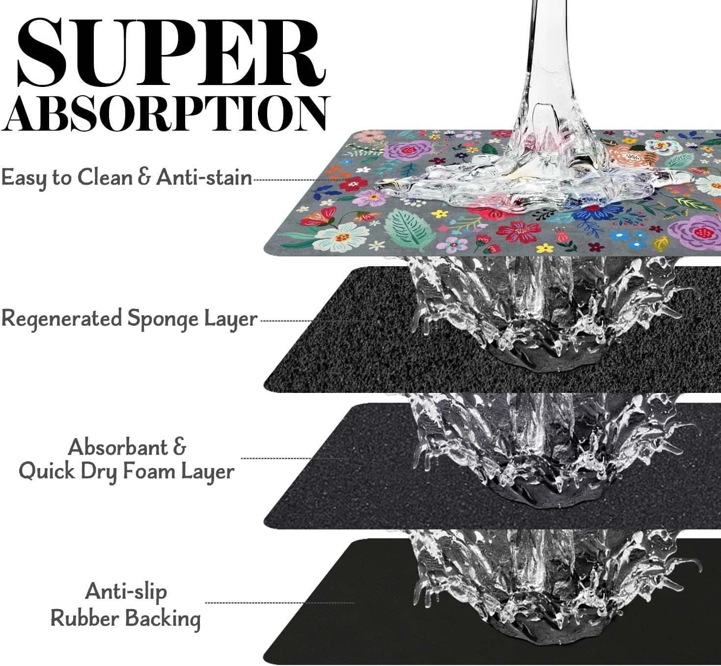 - Super Absorption: The dog mat for water bowl can absorb spilled water without leaving traces and dry quick, avoid wetting pet paws even for messy drinkers. And it does not attract pet hair like traditional silicone dog bowl mat.
