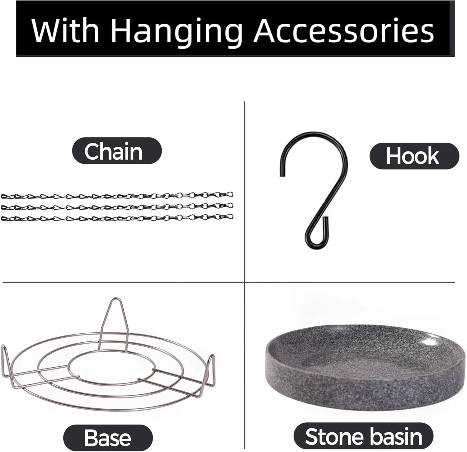 • Comes with 3 essential components : stone bird baths 10"L*10"W *1.6"D, Hanging Chain 15.7 inches, and a metal base for stability. Everything you need to set up a charming bird bath in your garden right away.