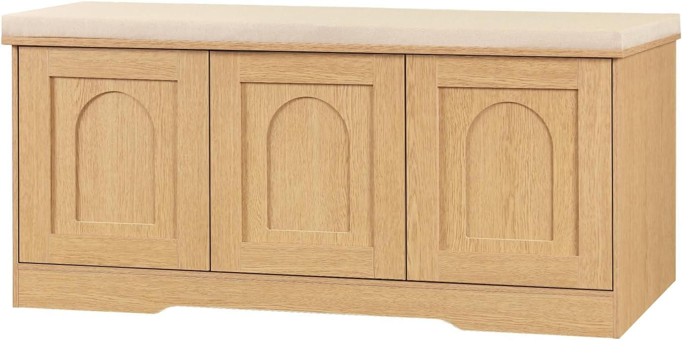 DINZI LVJ Shoe Bench, Entryway Storage Bench with Doors, Cushion, 2-Tier Shoe Rack with 6-Cubby, 39.4”L x 13.8”W Shoe Organizer Cabinet, Adjustable Shelf, Living Room, Bedroom, Natural