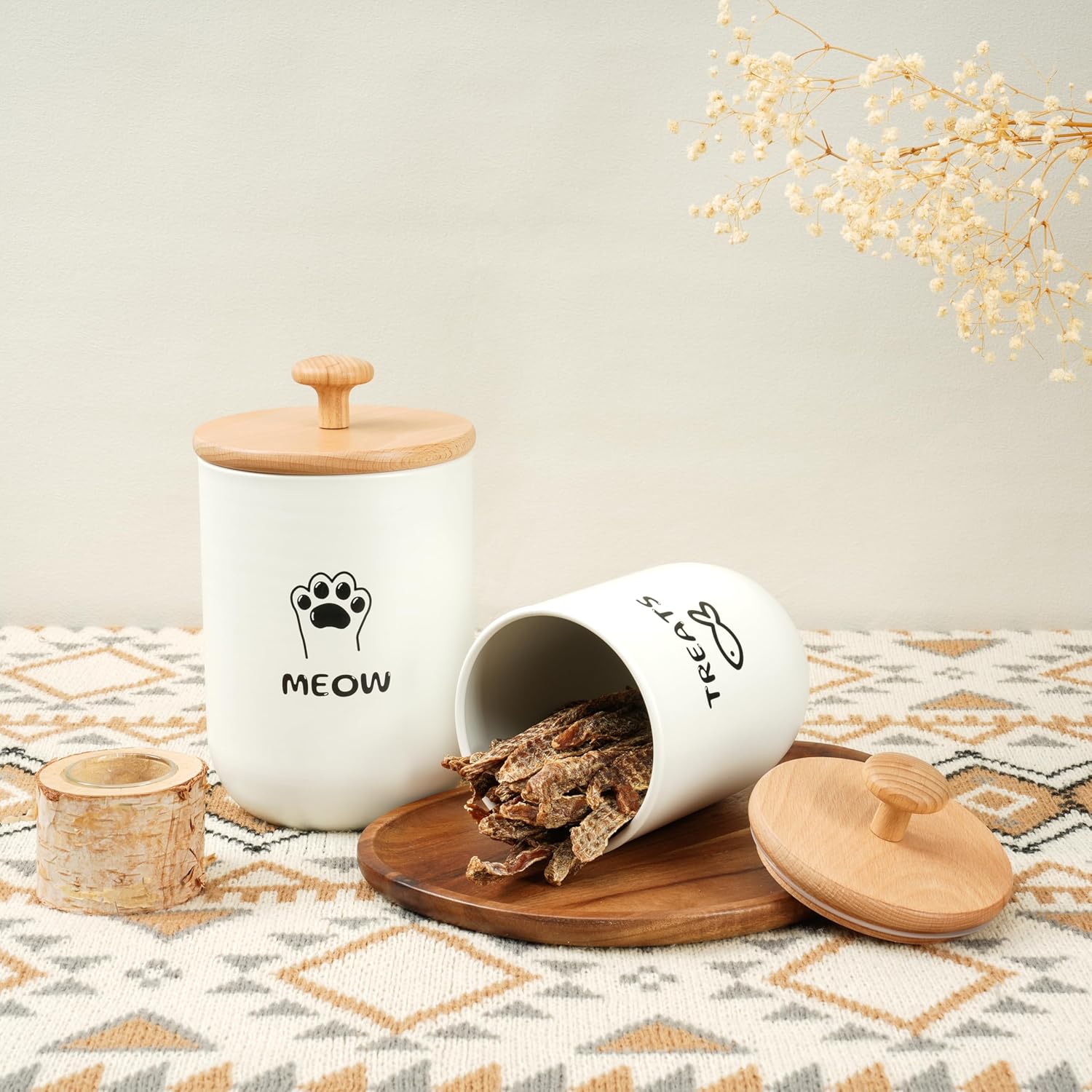 - Airtight Wooden Lids for Freshness – Equipped with airtight lids and stylish wooden tops, these cat treat jars for kitchen counter effectively block air and moisture, keeping your pet's treats fresh and crunchy. No more worries about stale or spoiled snacks—every bite stays delicious!