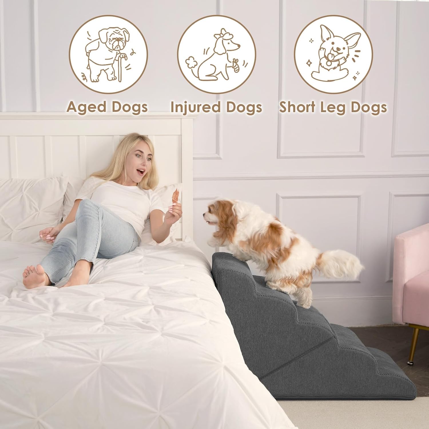 • COMFORTABLE PET STAIRS - This foam dog stair is designed directly against the edge of a bed, sofa or other furniture, so your pet can climb up and down comfortably.