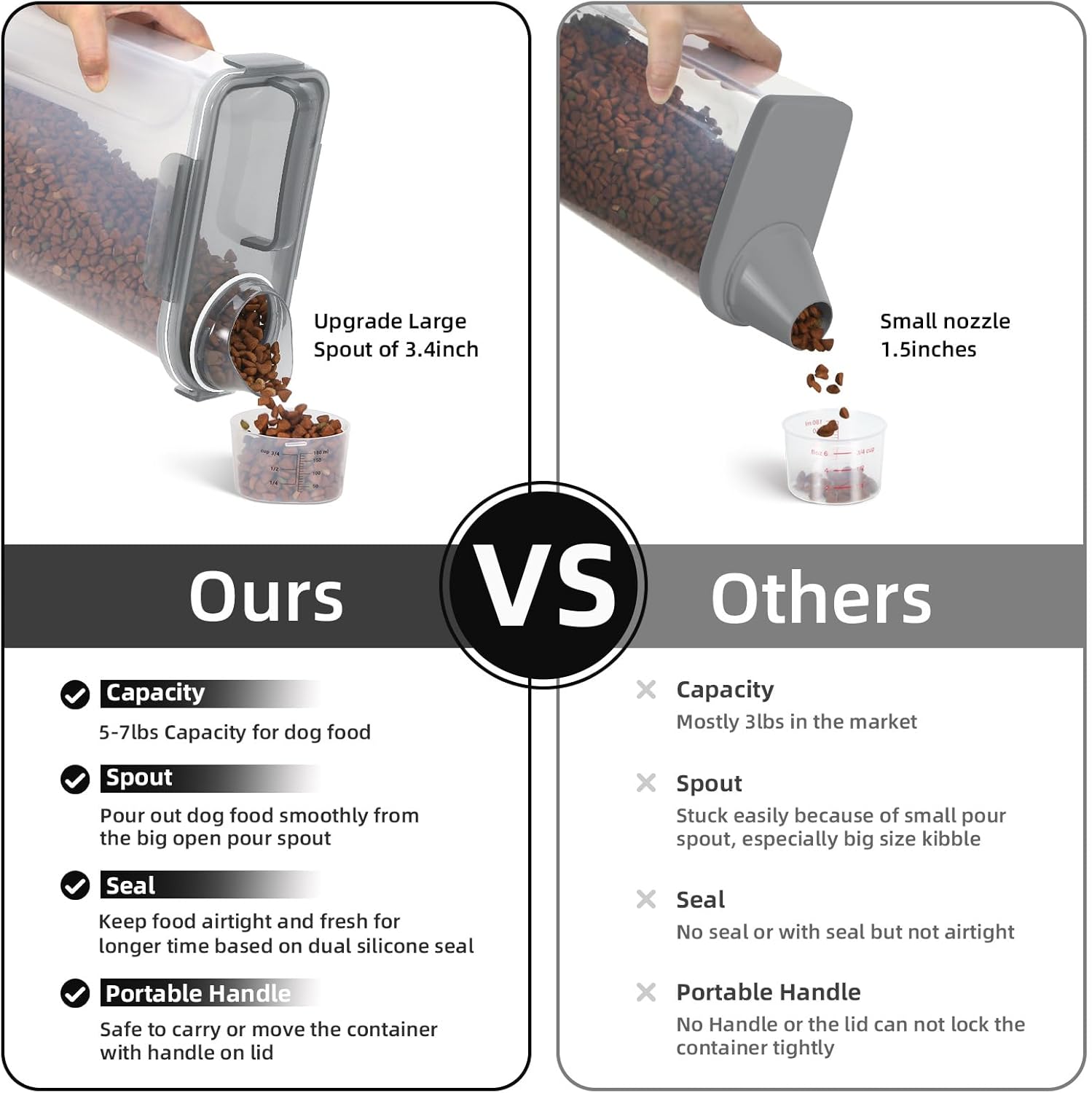 - BENEFITS: Upgraded Large Pour Spout with Measuring Cup-We upgraded the mold so that the pour spout is large enough to pour out large dog food.You can now pour food easily and quickly.The newly upgraded measuring cup can now also be easily screwed onto the nozzle