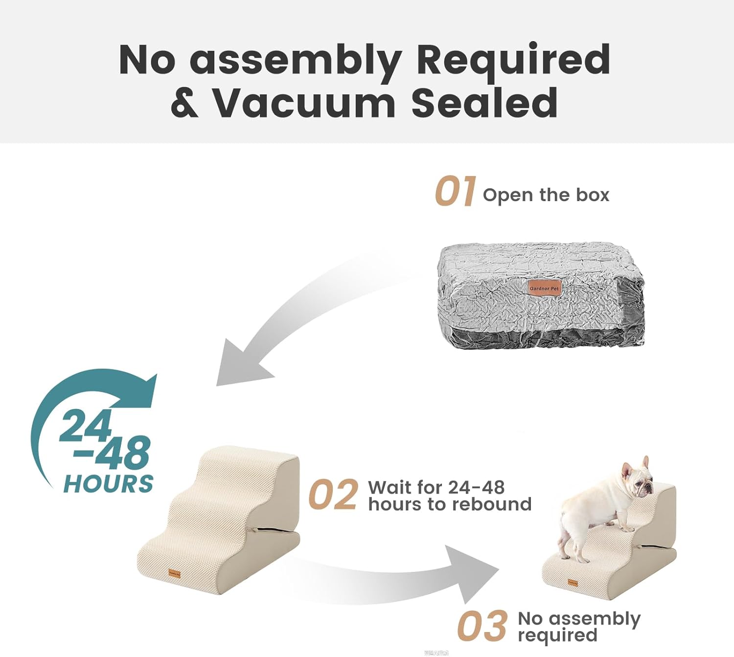 • No Assembly Required: The foam dog stairs for bed is convenient and hassle-free, simply unbox the pet steps, your furry friend can start using it right away. Due to vacuum compression, the surface of the puppy stairs may appear slightly wrinkled, and it will recover within 24-48 hours.