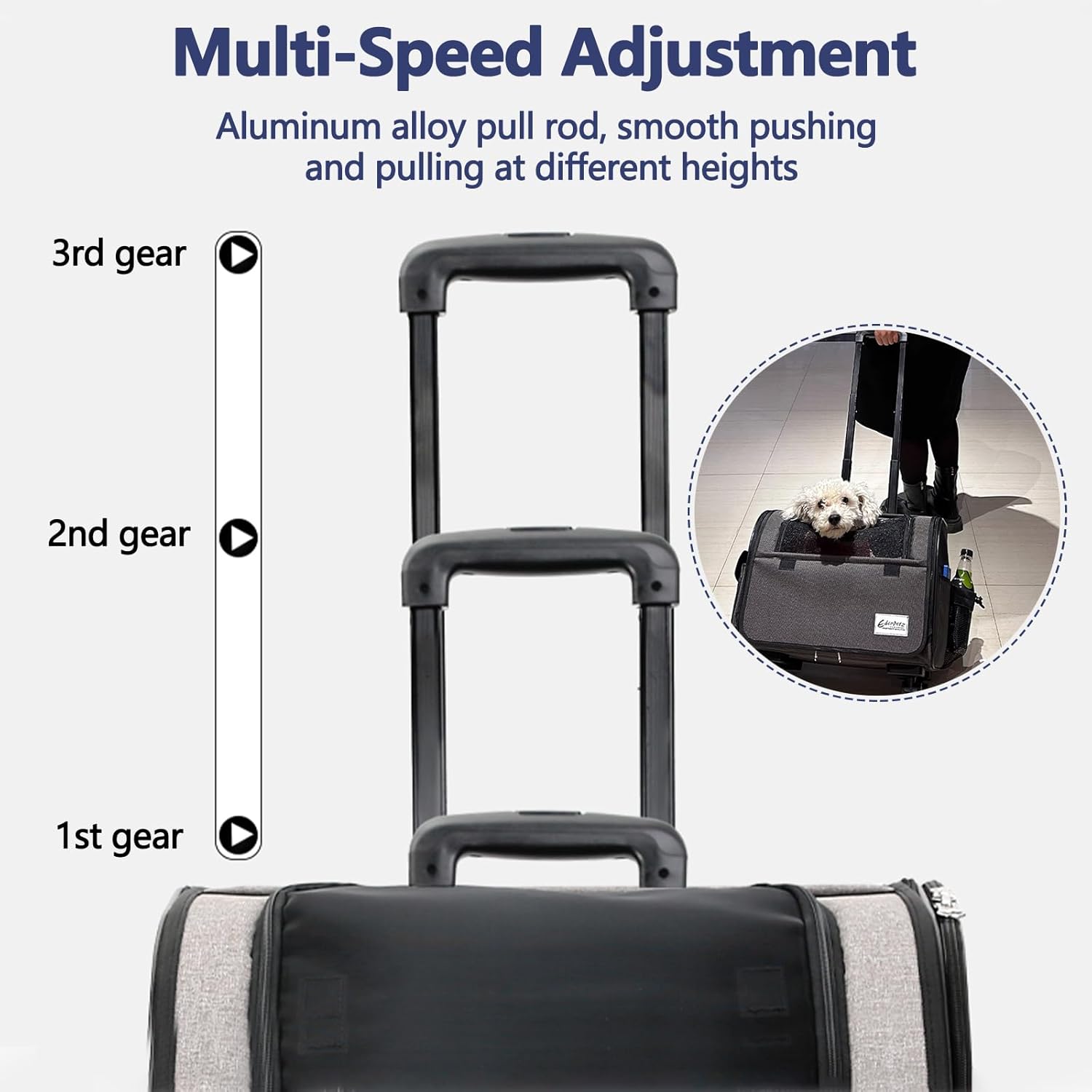 - Measure the size before purchase: This pet bag with wheels is 43*28*34 cm, suitable for pets weighing less than 10 kg. The pull rod has three gears that can be adjusted, and the highest gear is 60 cm. It can easily accommodate most small and medium-sized dogs and cats, such as Chihuahuas, Pomeranians, Corgis, Poodles, Schnauzers, etc.
