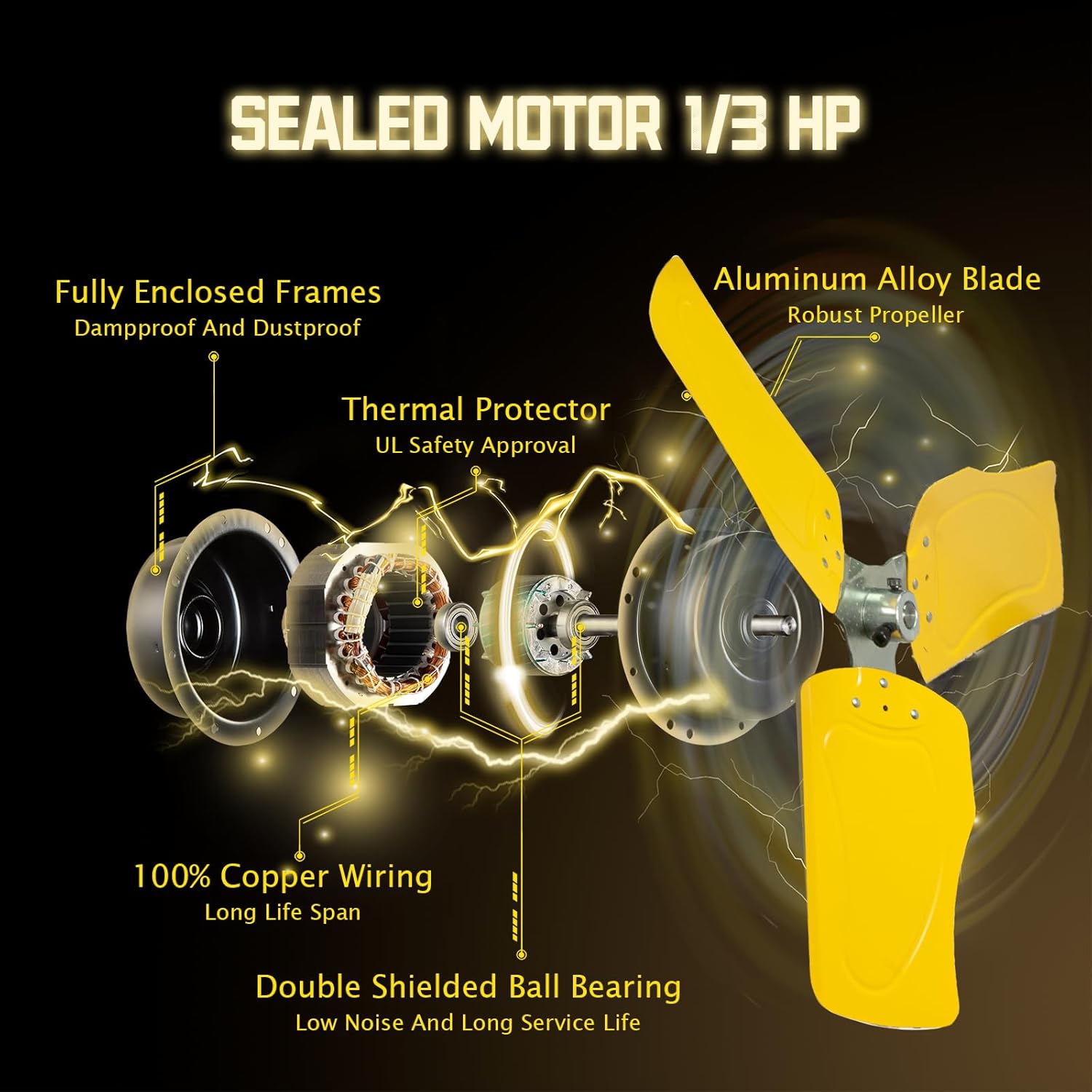 • 【Moves Much Air】: Built with 1/3HP Premium TEAO Enclosed Motor and Shielded Ball Bearings, this heavy duty industrial wall fan provides circulating breeze for large spaces, blowing distance reach 60 feet. It is ideal for Warehouse, Workshop, Factory, Garage, Basement, Greenhouse, Barn, Industrial, Commercial and Residential areas. High speed 9100 CFM / Low speed 7300 CFM