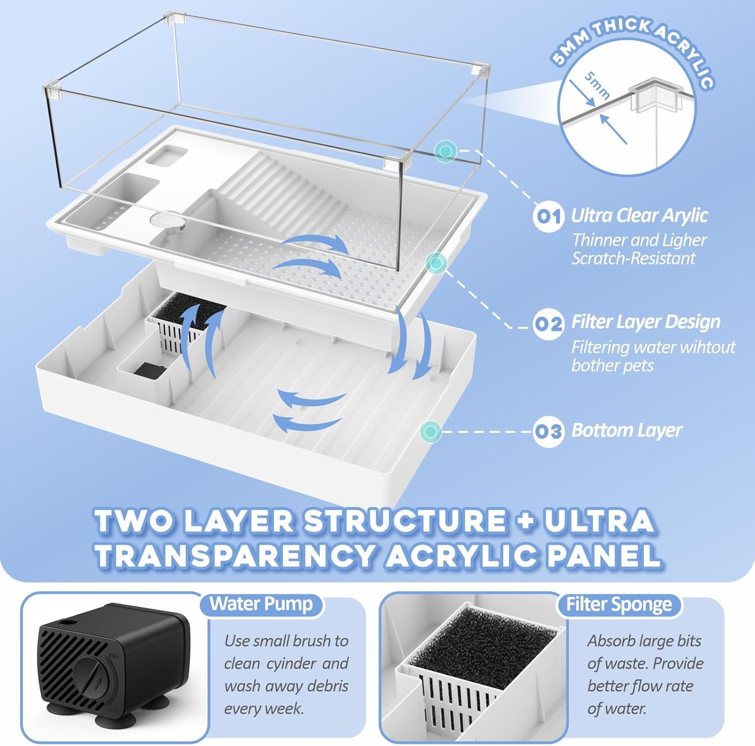 • 【TWO-LAYER DESIGN - EASY TO CHANGE WATER】Turtle tank base is a 2-layer separated design. Lift the first layer, food residue and excretion will sink into the bottom layer, then you can pour out all watse in the bottom layer and add fresh water; Save your time and trouble to drainage from a tiny hole slowly. During the process, your pet and other decorations in the tank just need to stay put and remain undisturbed. Note: Water should be refreshed 1-2 times per week, even with water pump.