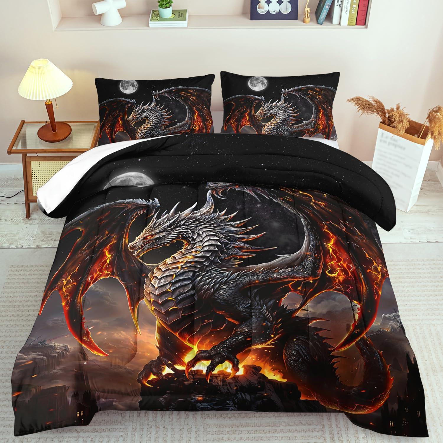Black Dragon Comforter Set Queen Adult,Flame Dragon Bedding Set for Boys,Magical Beast Bedding Fantasy Animal Comforter Beedroom Decor,Magical Beast Quilt Bed Decor