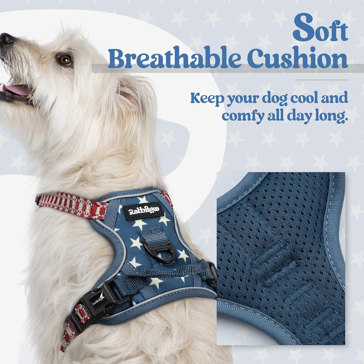 rabbitgoo Dog Harness No Pull with 2 Leash Clips, Adjustable Soft Padded, Reflective Oxford No Choke Pet Vest with Easy Control Handle for Large Dogs, Blue Star, XS